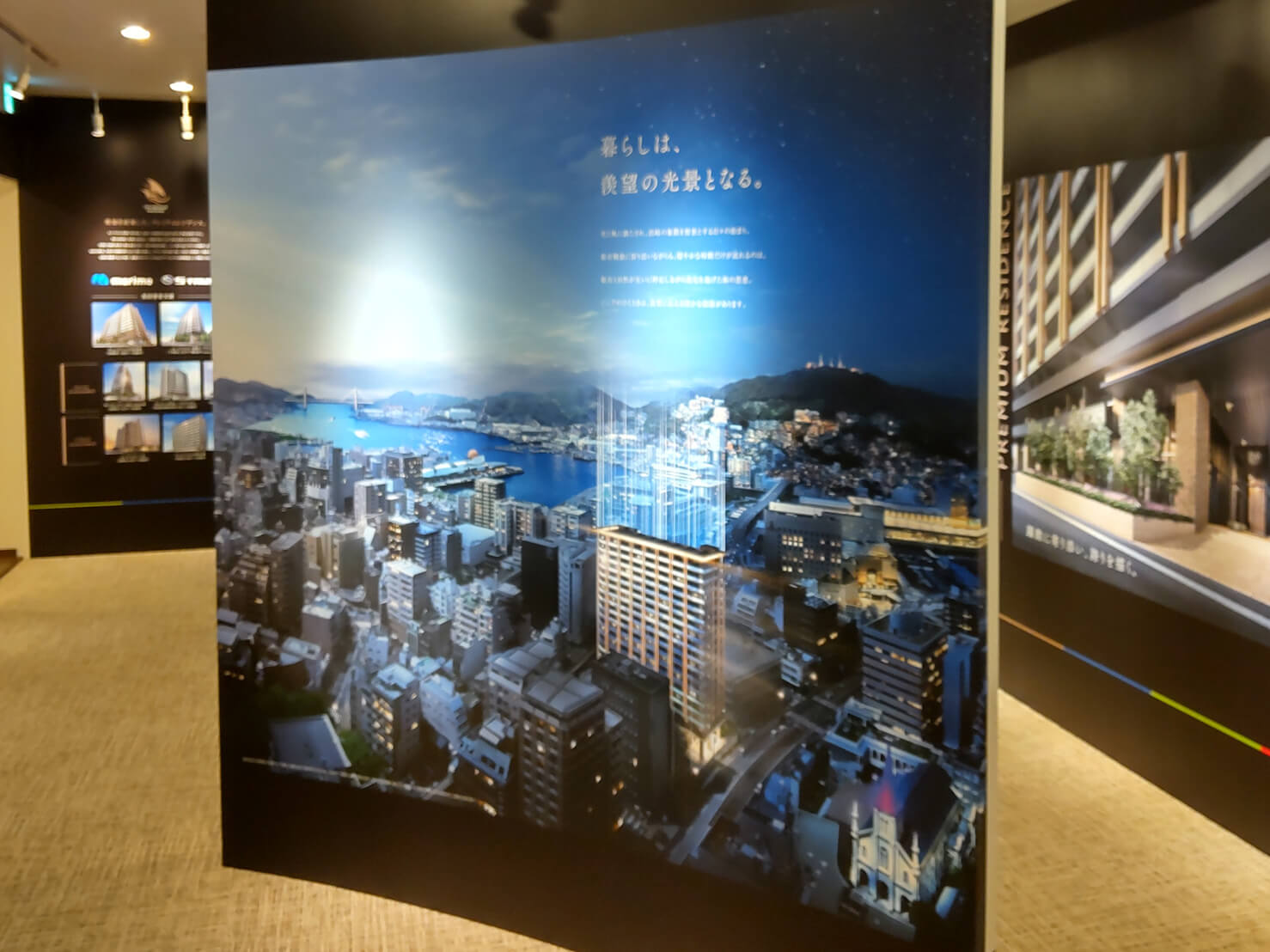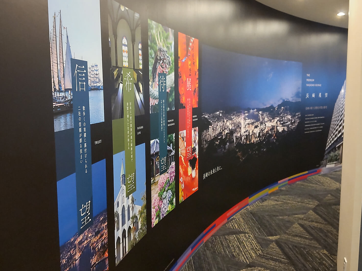 2023.09.27 長崎市 マンションギャラリー 内部施工 長崎市マンションギャラリーの内部施工を行いました。アクリルの内照サインや切り文字製作・設置を行いました。 展示コーナーにはインクジェットクロスを一面貼り、高級感のある仕上がりとなりました。
