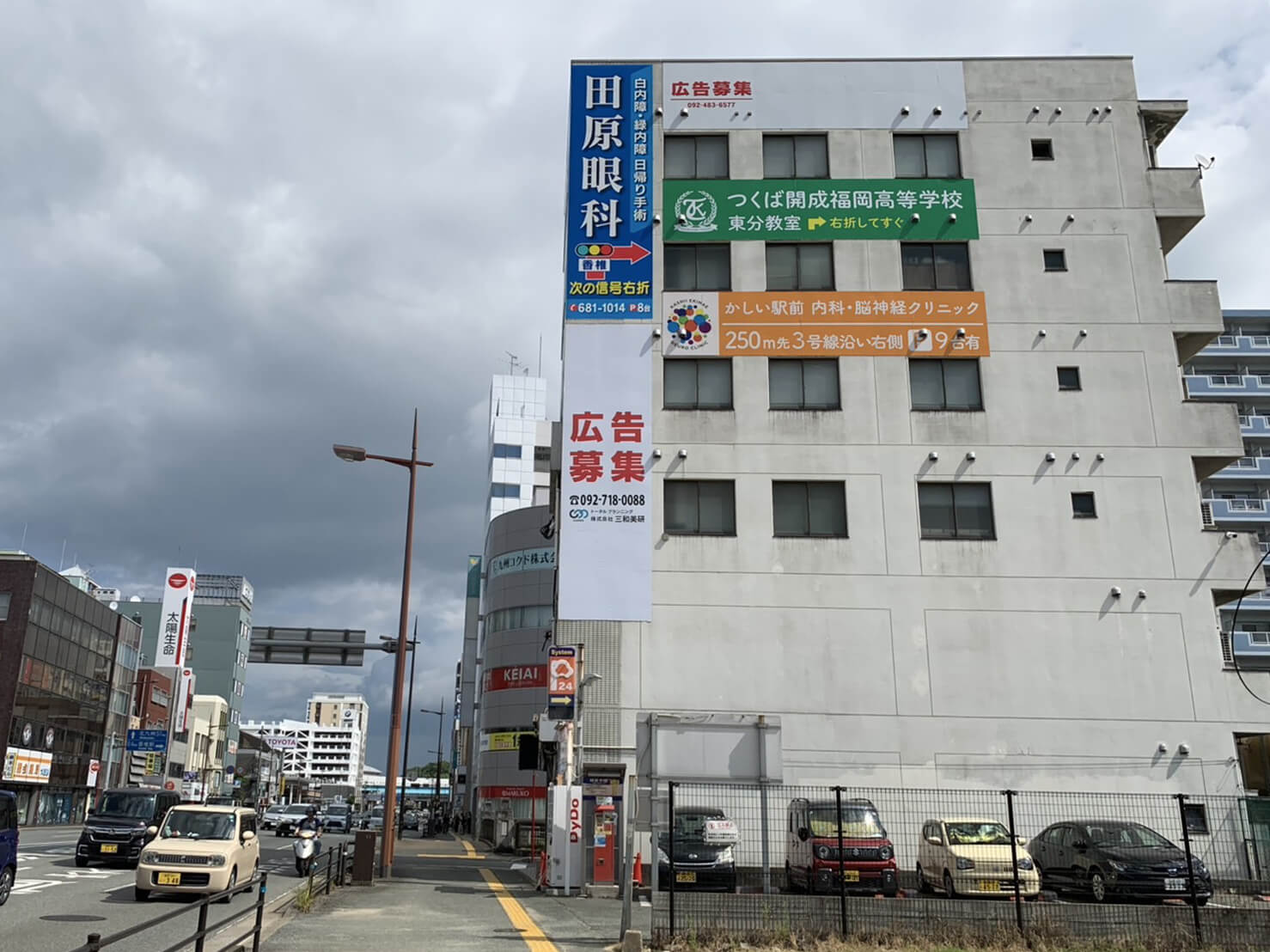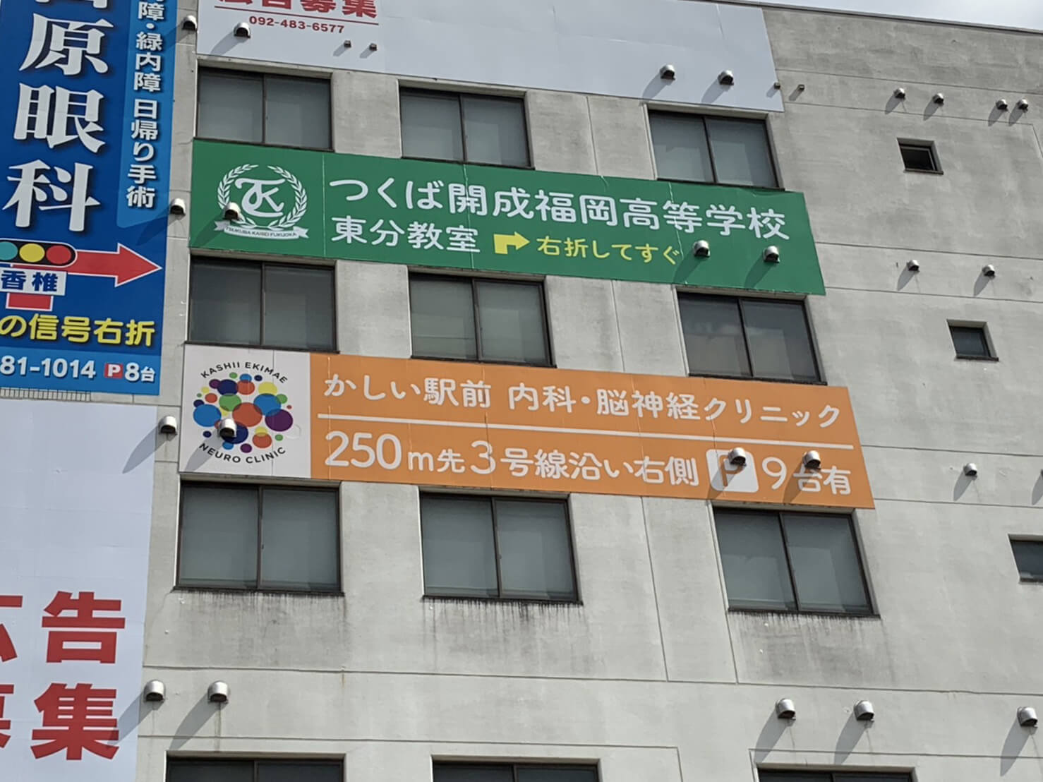 また、同壁面の縦長サインが広告募集中です。(2025年8月現在)ご関心ございましたら、まずはお気軽にお電話ください。(株式会社三和美研:092-718-0088)